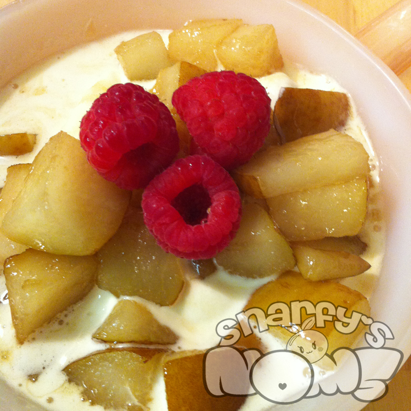 Budget 1/2 to a whole pear per person, and learn to eyeball your butter and brown sugar. Cut your pears into bite size chunks. Melt some butter in a pan over medium heat. Start with about 3 tablespoons and go from there. Toss the pears into the butter and sauté until tender. Add in your brown sugar. I’ve honestly never measured this and don’t know where to begin, but start with a few tablespoons and see where that goes. Cook everything together until the sugar melts into the butter. Serve the sautéed fruit over some good quality vanilla ice cream and top with some fresh raspberries. OMG. YES.