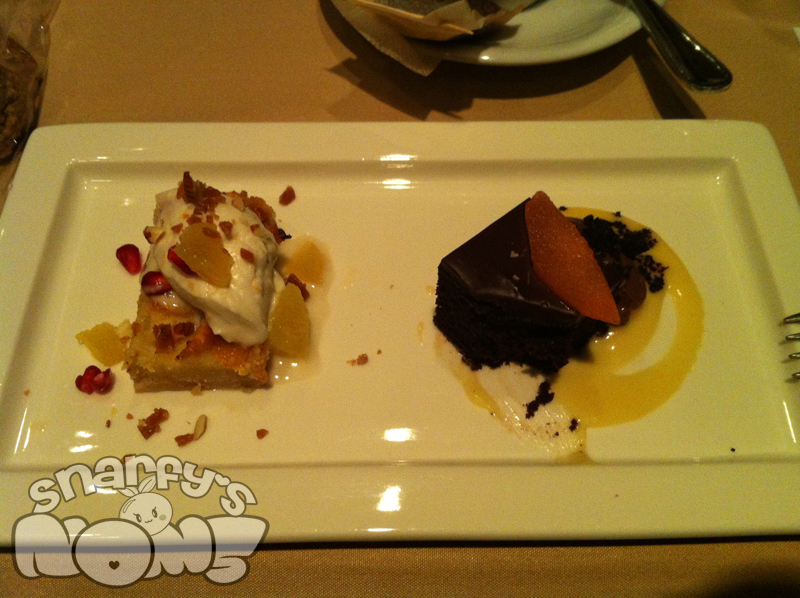 Rehearsal Dinner: Two desserts! On the left is an almond-orange tart, and the right is a ginger chocolate cake. Revival Bar and Kitchen
