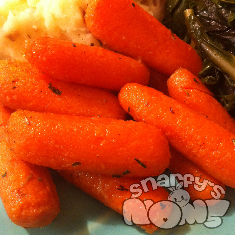 Your oven should already be hot because you have a meatloaf in there, remember? Otherwise, pre-heat that bad boy to a high temp (425-450 deg f). Dump that bag of baby carrots into a rimmed baking sheet while you melt some butter down in a saucepan. Put that thyme and rosemary in there (you could also include a little garlic) to infuse the flavors in the butter. You don’t have to do this long, so when you’re ready, pour that herby melted butter over those carrots and make sure everyone is coated. Rain a little salt and pepper over those carrots and pop them in the oven until they’re tender. Then nom the crap out of them.