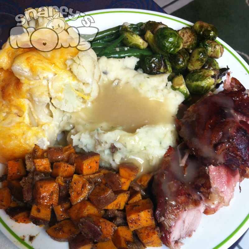 As you can see below, I’m totally all about the sides when it comes to a feast day. I’m posting about the roasted Brussels sprouts (upper right), cheesy cauliflower (left side), and cranberry sauce today. The other recipes for foods on my plate are linked from this post.