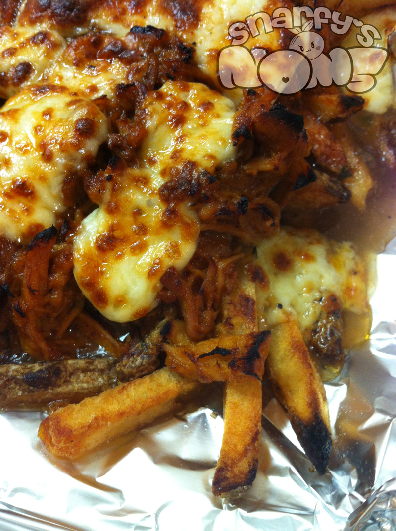 To turn this into Pulled Pork Poutine, get yourself an ungodly amount of fries. We ran over to Five Guys because those are my favorite fries and they’re so close to Arc’s house. You could make your own, but homemade fries is the one thing I suck at making. Make a batch of gravy and have your pulled pork and cheese curds at the ready. Put a bed of fries in some sort of oven safe cookware and add the gravy. Top with an inappropriate amount of pulled pork and cheese curds. Oh, I totally used cheddar cheese curds, but I want to grab some gouda curds the next time I’m at the farmer’s market and do this again. Once you got your fries covered in gravy, pork, and cheese, those that in the oven to get the cheese nice and melty. Yeah, next time I’m making a batch of rich mushroom gravy and doing gouda curds. Oh yessssss…