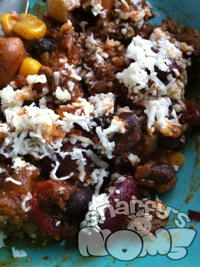 Dish your chili up into bowls and top with cheese. If you like less liquidy chili, you can cut the amount of tomato sauce in half. Sometimes Arc throws in a can or two of sliced olives. Sometimes he makes it really really thick and I thin it down with a little veggie broth because sometimes I just like it juicy.