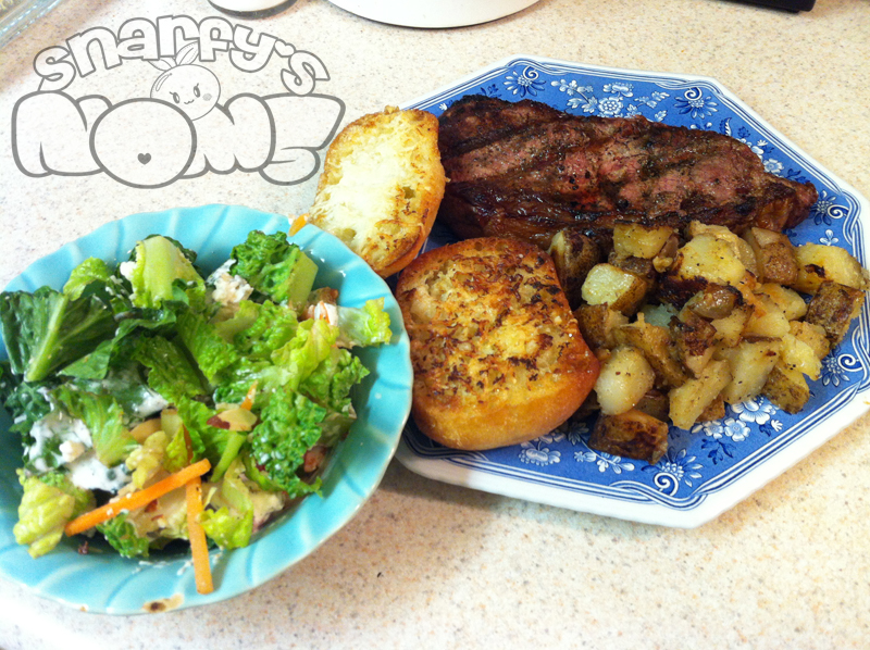 Arc was in charge of grilling our rib eyes to perfection and OMG seriously they were perfect. The rest is ranch potatoes, garlic bread (which I didn’t have), and a green salad topped with sliced almonds and blue cheese. Oh yeah, with homemade ranch dressing because screw buying that bottled stuff.