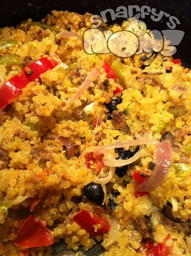 Once your quinoa is cooked, stir in your cooked sausage and veggies. Add your cheeses and mix well. Stir in the cherry tomatoes, olives, and basil. Served topped with a little bit of marinara sauce and more cheese. Delicious!