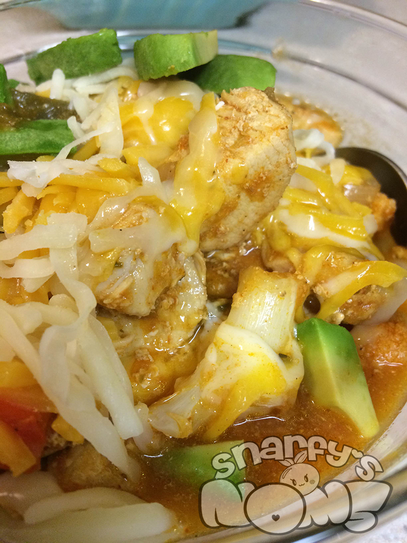 Add chicken, onion, and chipotle to a cooking vessel of your choosing. Saute until the chicken is cooked. Season to taste with taco seasoning. Add the cauliflower, bell pepper, jalapeños, tomato sauce, and chicken broth. You can add more tomato sauce and chicken broth if you want a saucy chili. You can even thicken it up with a little cornstarch slurry if you like. I left mine only slightly saucy and thin though. Let simmer on low heat for as long as you like, although take care to not over cook the veggies into mush. I basically let everything simmer until the cauliflower was cooked through because I needed to put it in my face. If you want this to be an all day simmer, or if you want to translate this to a slow cooker, I would withhold the veggies until the end so they don’t get over cooked. Serve with cheese and avocado on top (see below). If you want a spicier chili, you can add more chipotles for a smokey spice, or add more cayenne or red pepper flake.