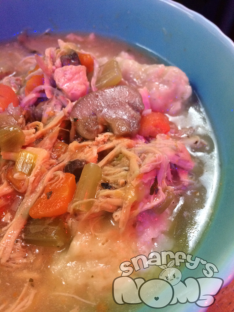 Once the meat is cooked and tender, pull the chicken out of the pot and remove the bones. Discard with the skin. Shred the meat lightly and return to the pot with the broth and veggies. In a separate pan, heat some butter or cooking fat of your choice and saute the leeks and mushrooms. Add into the pot with the soupy stuffs. At this point, simmer for as long as you like to really infuse that broth with flavor. When you’re ready, start to prep the dumplings. If you would like a thicker sauce at this point, go ahead and use a cornstarch slurry.